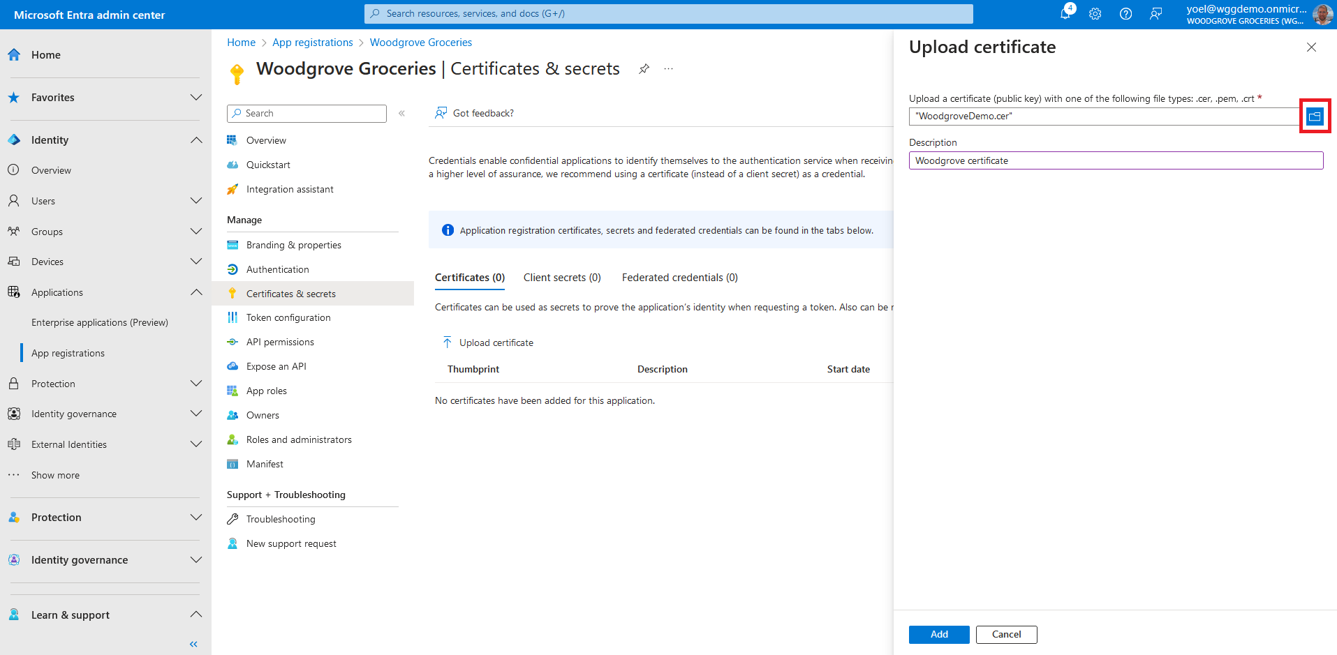 live demo we use a certificate. To add a certificate, select Certificates & secrets >